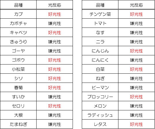 「好光性種子」と「嫌光性種子」について主な品種をまとめました。