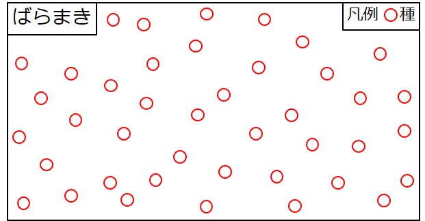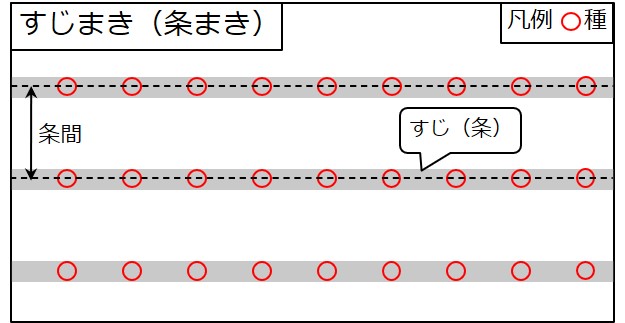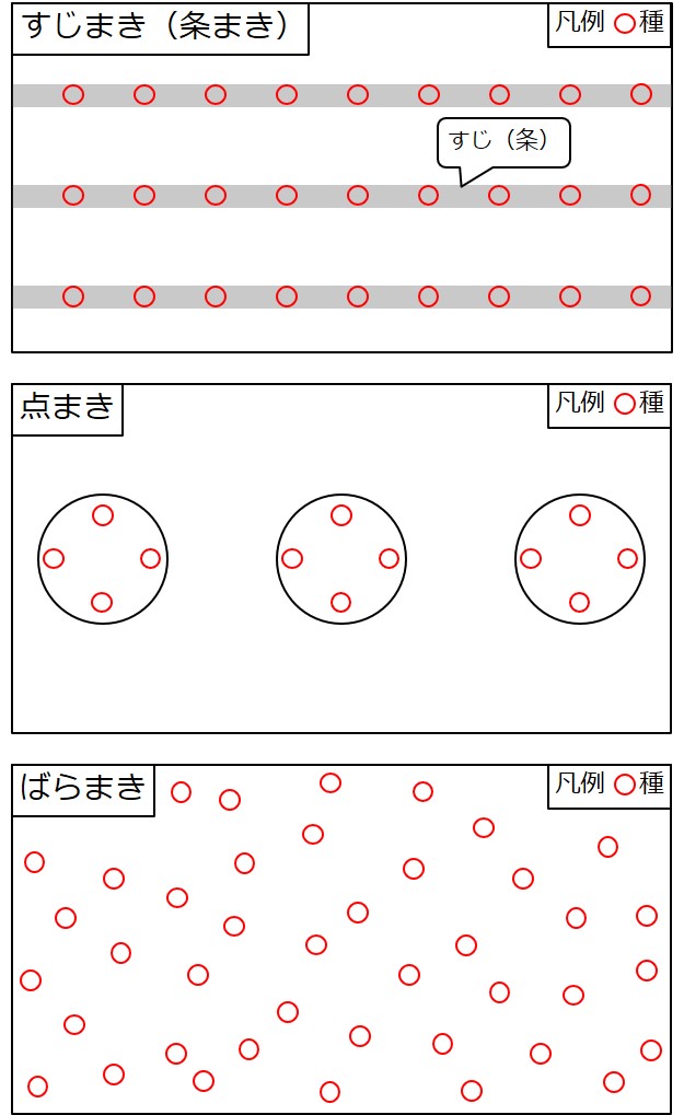 ●「直まき」には3つ種類がある「すじまき(条まき)」「点まき」「ばらまき」