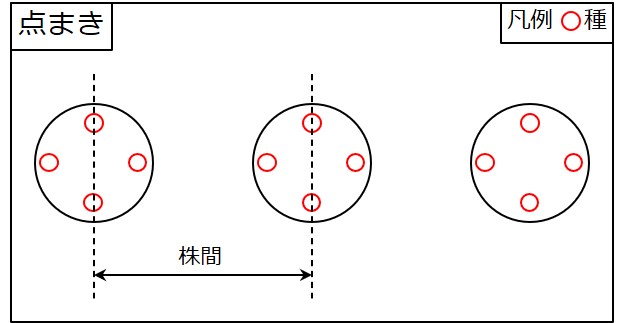 1つの点(くぼみ)は5~10cm程度、1つの点(くぼみ)に2~5粒ほどの種をまきます。