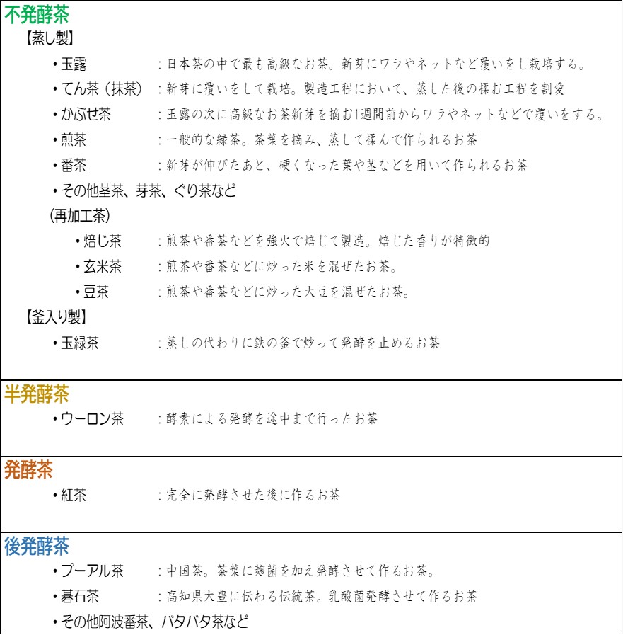 「不発酵茶」「半発酵茶」「発酵茶」「後発酵茶」になります。