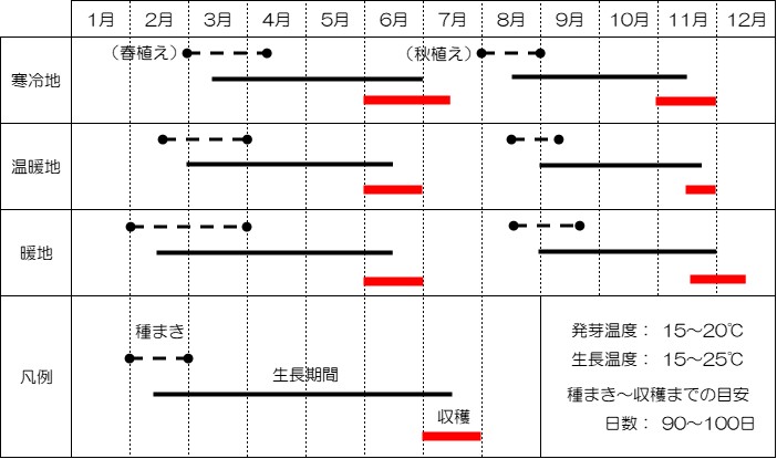 春植えと秋植えでは温度・栽培期間など条件が違います。