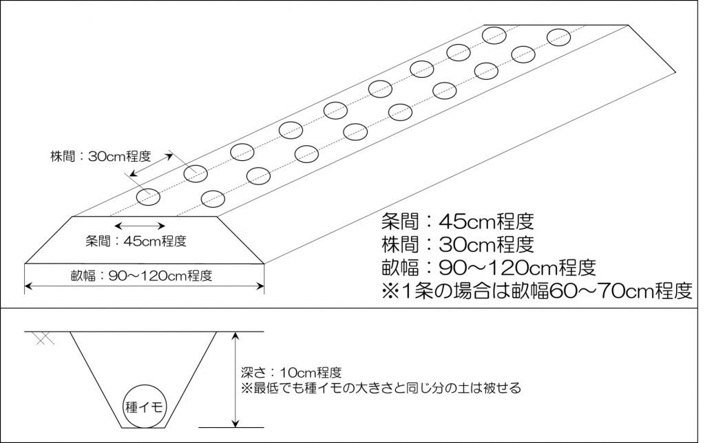 ・畝幅は1条なら60~70cm程度、2条なら90~120cm程度